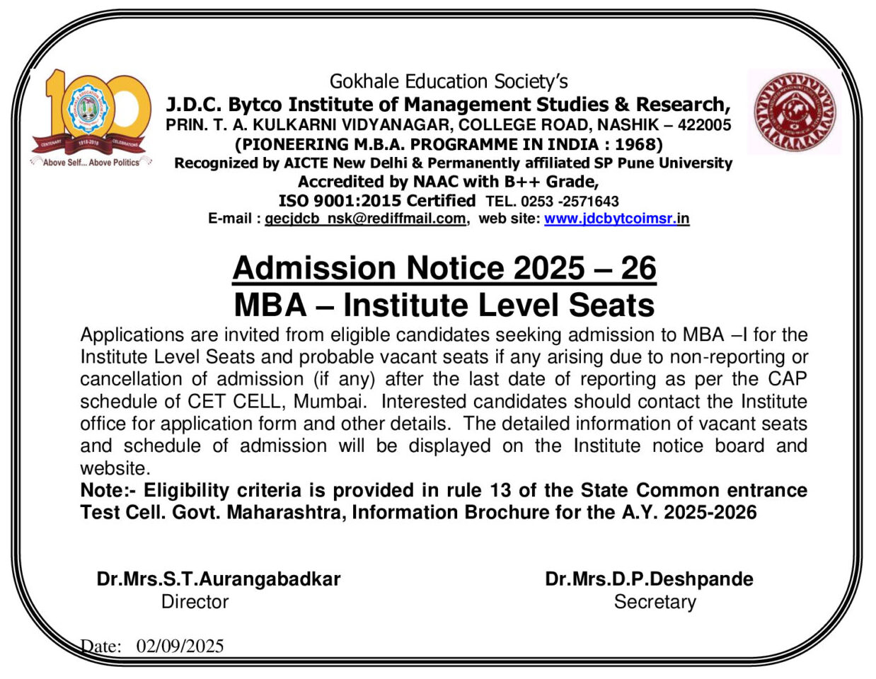 Notice 2025-26 MBA Institute Level Seats